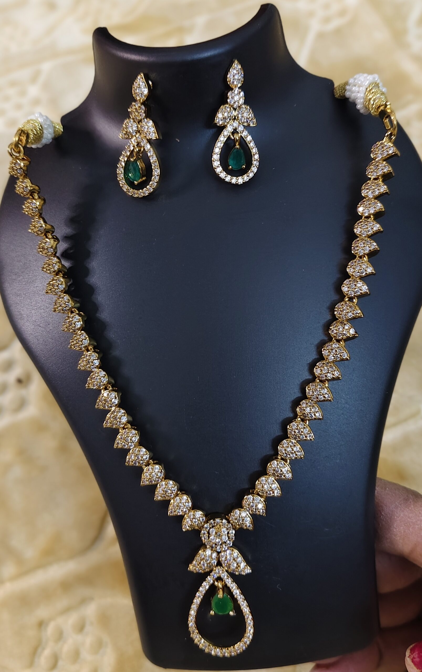 Enhance your style with this elegant Neck Piece and Earrings set, featuring dazzling green stones. Perfect for special occasions or daily wear, this set combines sophistication with versatility.